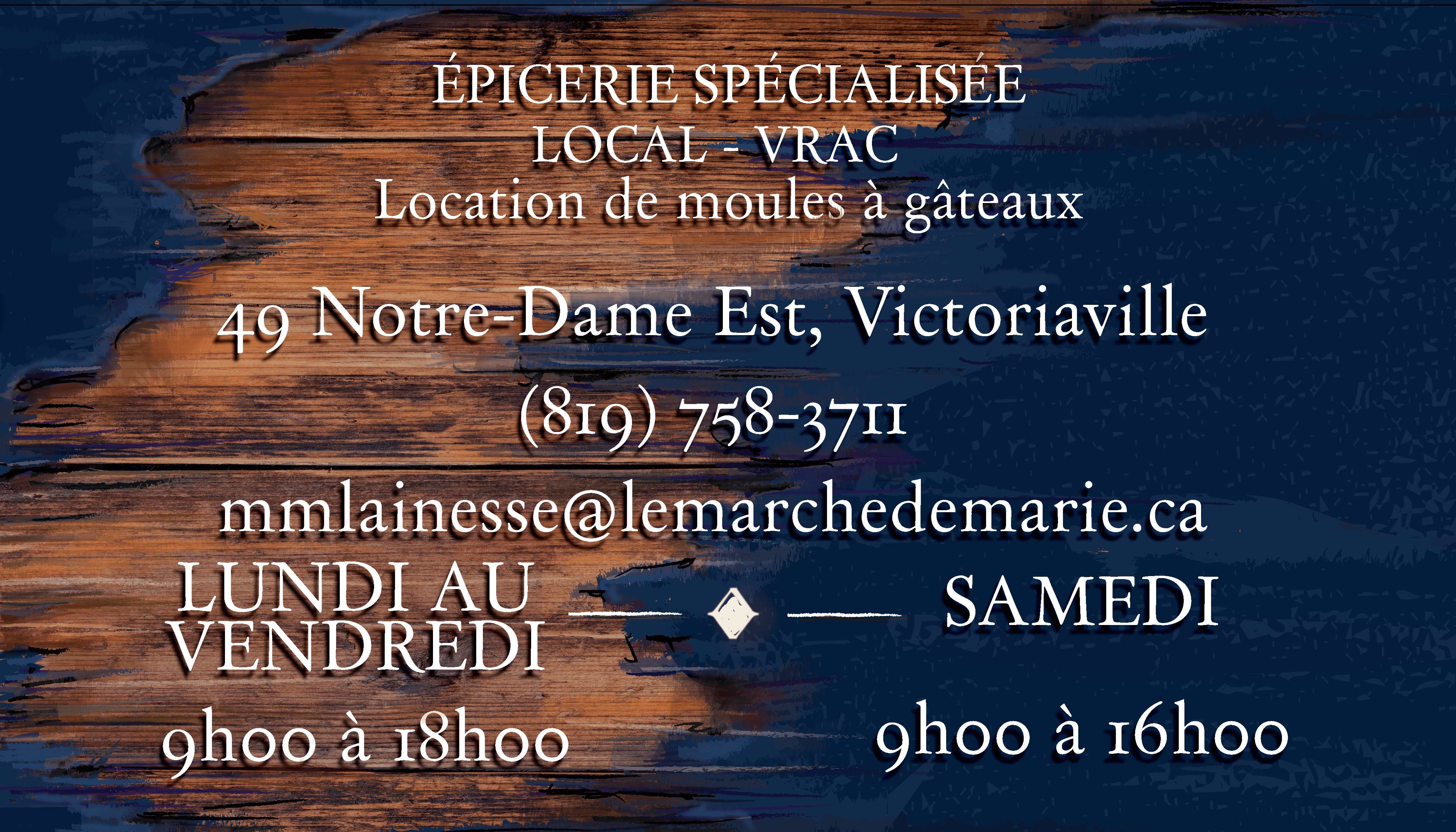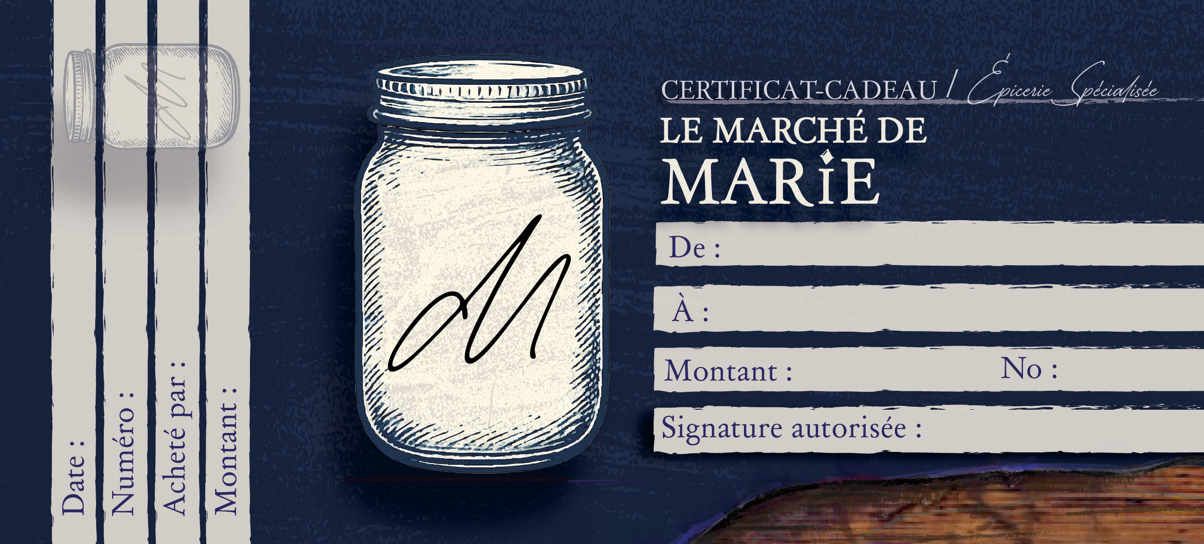 ENGLISH : Le Marché de Marie is a neighborhood grocery store specializing in local and bulk products. It also stands out for its unique service of selling and renting cake molds. The owner, Marie-Michelle, entrusted me with the task of revitalizing the brand’s image, to modernize its visual identity while preserving the warm, rustic charm characteristic of this type of charismatic small business. I was therefore responsible for the design of various visual assets (business cards, in-store signage, reference labels), as well as the creation of custom decorative * elements, including a tablecloth, in order to ensure overall visual coherence.